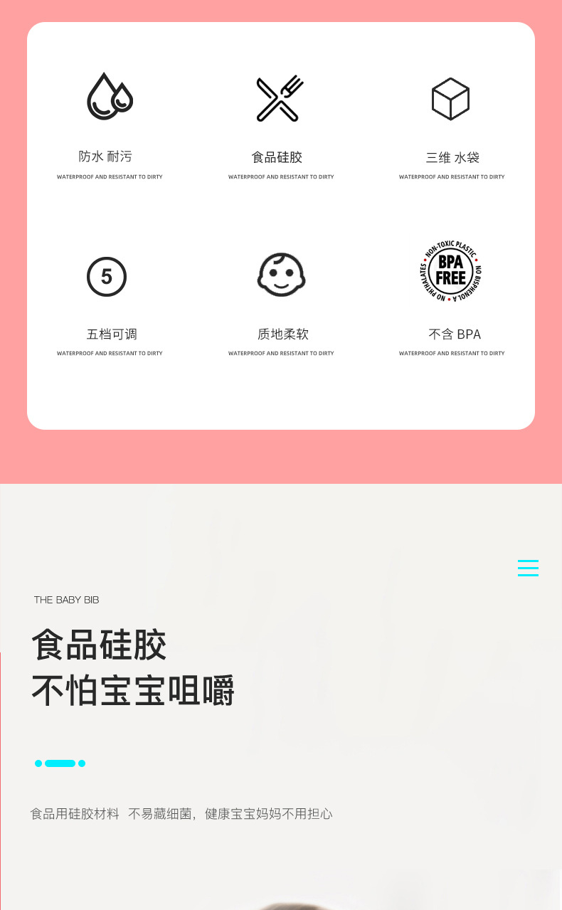 嬰幼兒唾液分泌一直以來每個家庭中都沒有得到很好的解決方法,嬰兒從出生知道一歲多這個時間段里面張嘴口腔動作屬于萌芽期,所以流口水也不是它們的錯,吃飯灑漏更不是他們的錯,所以寶媽們洗衣服也是沒理由的,而目前只能選擇以預(yù)防為主,而硅膠圍嘴兜目前是主要的嬰幼兒防護用具,所以看準這幾個因素選對圍兜可輕松很多。