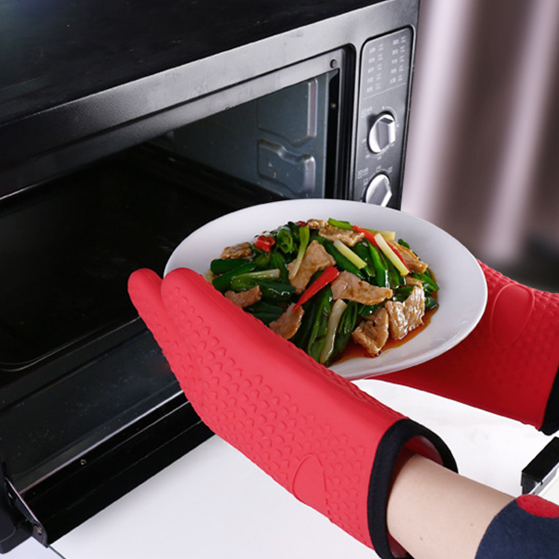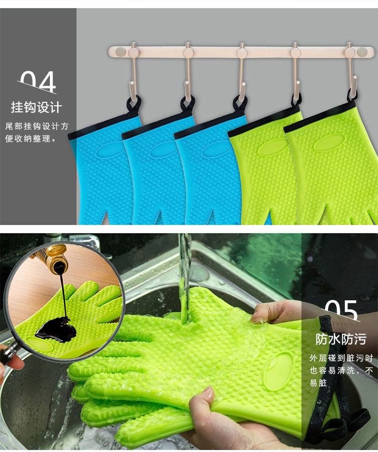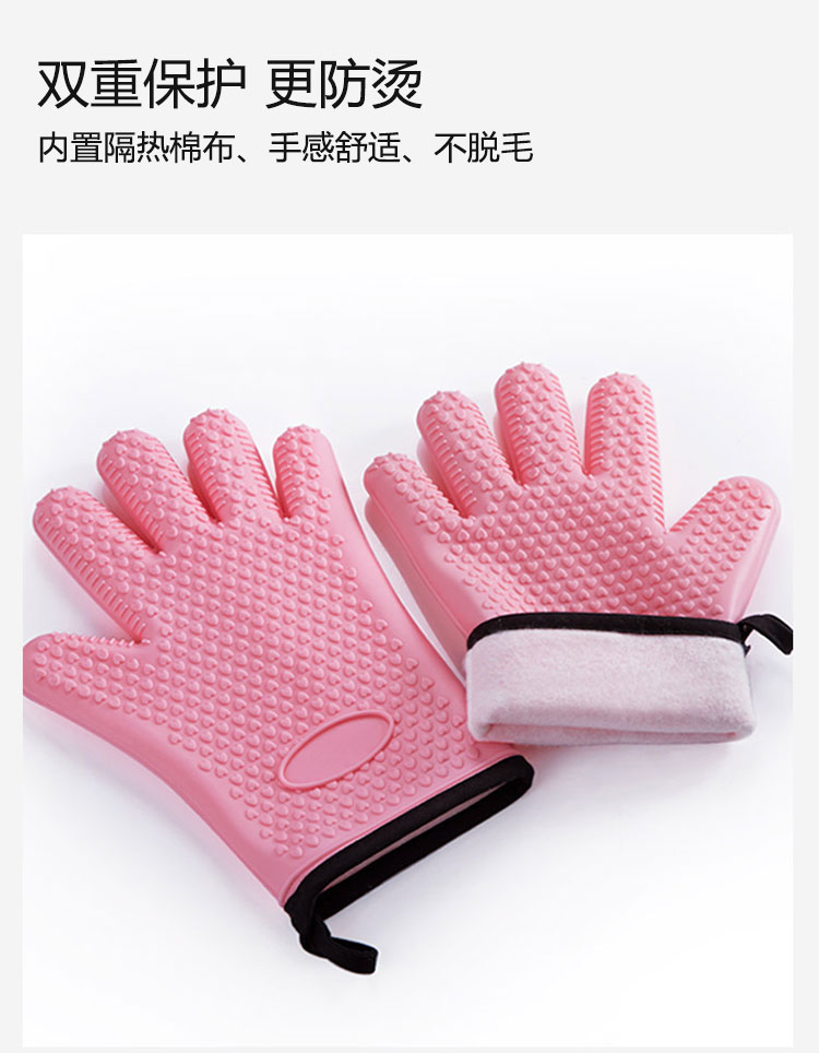硅膠烘焙手套質(zhì)地柔軟,分指設(shè)計,防滑防臟,內(nèi)置隔熱棉,有效保護(hù)雙手。