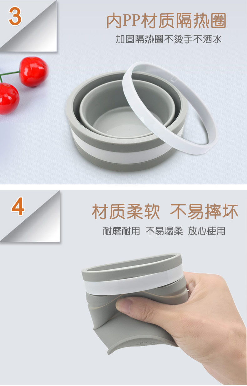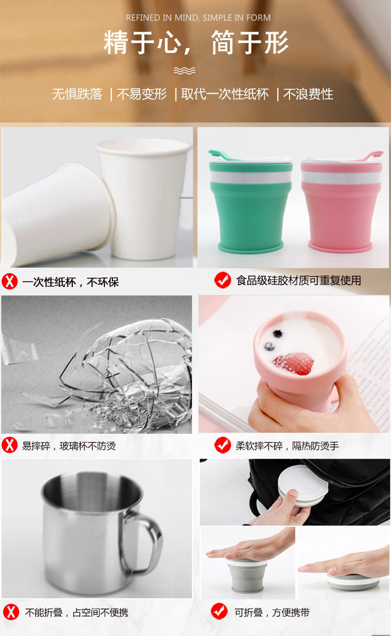 折疊式硅膠水杯成為運(yùn)動(dòng)以及郊游的便攜物品之一,水喝完后直接折疊放入口袋減小儲(chǔ)物空間替代了對(duì)水壺和瓶裝礦泉水的不足, 完全顛覆了消費(fèi)者對(duì)硅膠折疊水杯的看法,硅膠折疊杯是一種攜帶方便、使用衛(wèi)生、具有雙層杯壁的折疊杯。外壁的兩個(gè)相鄰段通過(guò)螺紋連接,內(nèi)壁的兩個(gè)相鄰段為錐形配合,可上下移動(dòng)。通過(guò)外壁螺紋旋轉(zhuǎn)驅(qū)動(dòng)內(nèi)壁上下展開(kāi),實(shí)現(xiàn)杯形折疊和拉伸動(dòng)能。