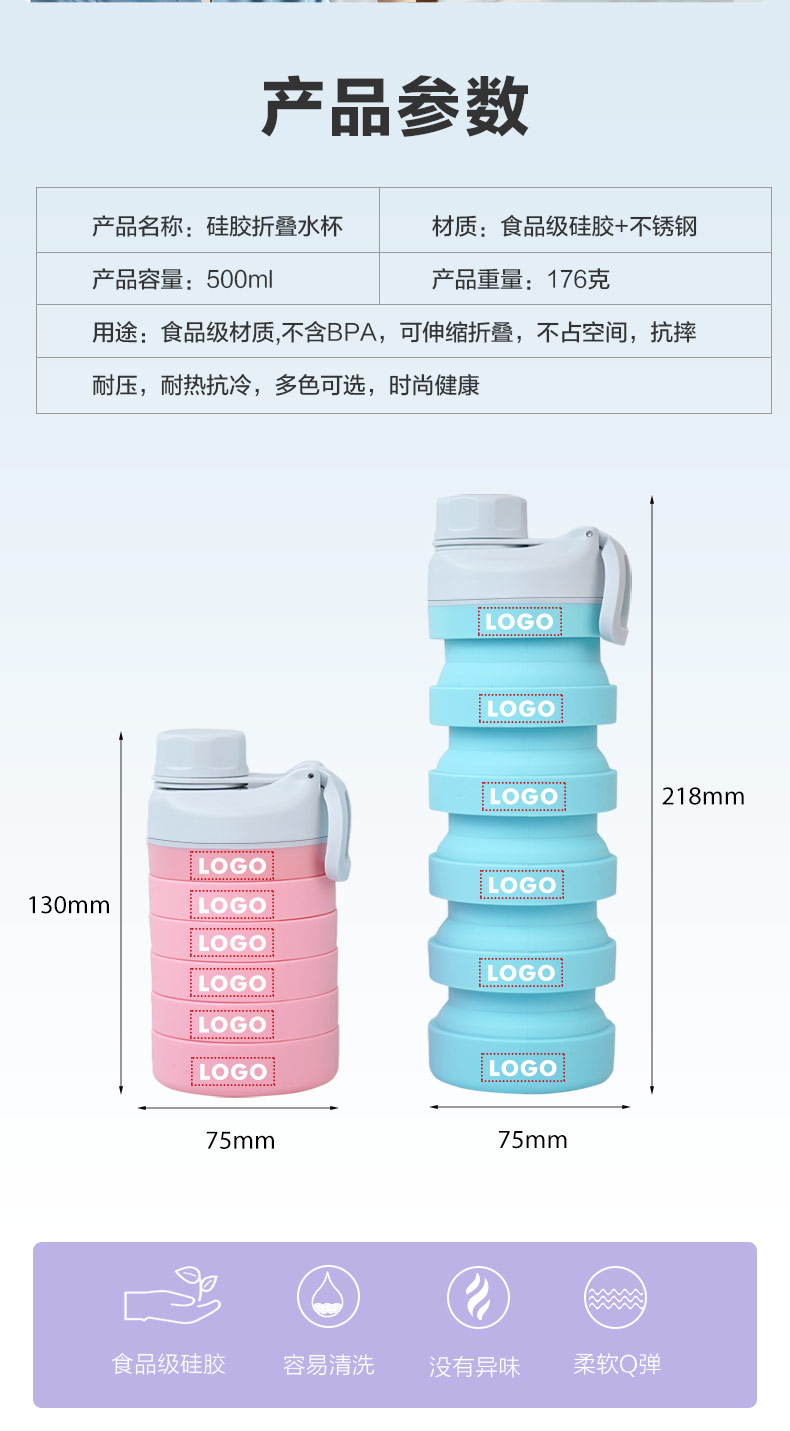 用途:食品級材質(zhì),不含BPA,可伸縮折疊,不占空間,抗摔 耐壓,耐熱抗冷,多色可選,時(shí)尚健康